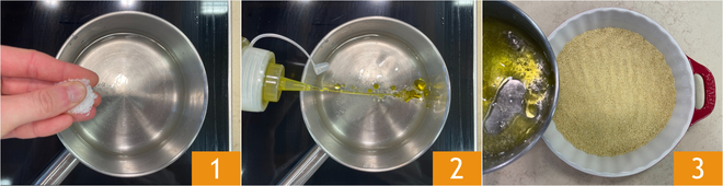 Para preparar el cuscús con verduras y atún, primero vierte el agua en un cazo, añade la sal 1 y el aceite 2 y lleva a ebullición. Pon el cuscús en una bandeja o en un plato amplio y vierte el agua hirviendo encima 3.