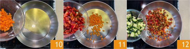 En una sartén, calienta un poco de aceite, añade las zanahorias 10 y cocina durante 4 minutos a fuego medio. Luego añade los pimientos 11 y los calabacines 12.