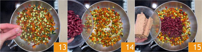 Repite con sal 13 y sigue cocinando durante unos 10-15 minutos. Con el fuego apagado, añade los frijoles rojos 14 y el atún 15.