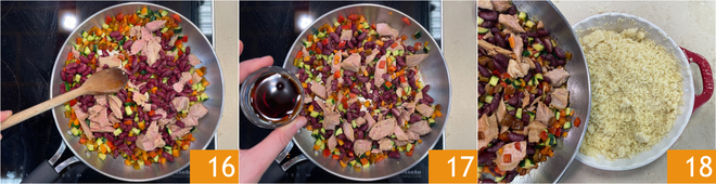 Mezcla bien, desmenuzando el atún con la cuchara 16. Sazona con la salsa de soja 17 y mezcla de nuevo. En este punto, puedes condimentar el cuscús 18.