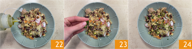 Sirve en platos y adorna con un poco de aceite 22 y más perejil picado 23. ¡Tu cuscús con verduras y atún está listo para disfrutar 24!
