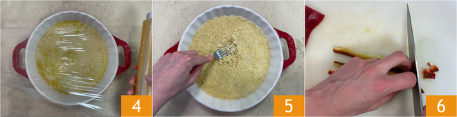 Cubre con film 4 y deja reposar durante 2 minutos. Consulta el paquete de cuscús para ver la cantidad de agua a utilizar y el tiempo de reposo. Una vez transcurrido el tiempo necesario, desgrana el cuscús con los dientes de un tenedor 5 y reserva. Pasa a las verduras: elimina el pedúnculo, las semillas y los filamentos internos del pimiento, luego córtalo primero en tiras, luego en tiras finas y finalmente en pequeños cubos 6.