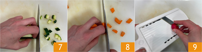 Haz lo mismo con los calabacines 7 y las zanahorias 8. Corta finamente los rábanos con una mandolina 9.