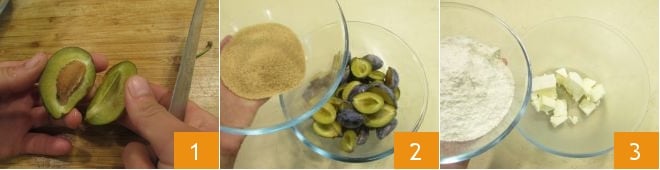 Para realizar el cobbler de damascos, lo primero que hay que hacer es lavar las ciruelas, cortarlas por la mitad 1, quitar el hueso y recogerlas en un bol, añadir el azúcar moreno, mezclar y reservar. Ahora ocupaos del crumble: en un bol colocar la mantequilla fría en trozos, añadir la harina 3