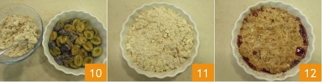 verter en el fondo las ciruelas 10 y desmenuzar en la superficie el crumble, de manera que cubra completamente las ciruelas 11. Cocer el postre en horno estático precalentado a 190° durante 55 minutos. Una vez cocido, sacar del horno, dejar templar y luego disfrutar de vuestro cobbler de damascos 12!
