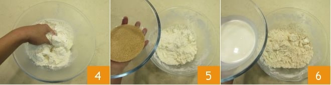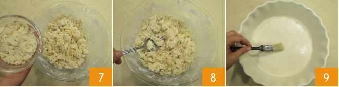 y amasar rápidamente con las manos 4 para obtener una mezcla desmenuzada. Añadir en este punto el azúcar moreno 5, mezclar y verter la nata 6 mezclar de nuevo para absorber el líquido