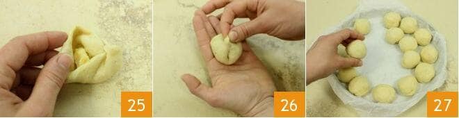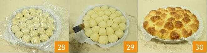 Cerrad cada disco pellizcando y sellando bien los bordes para que el relleno no se salga (25-26) y continuad con todas las bolitas. A medida que realicéis el danubio, podéis colocar las bolitas en un molde de 28 cm de diámetro forrado con papel de horno, disponiéndolas en forma de corona a partir del perímetro más externo 27, hasta llegar al centro.