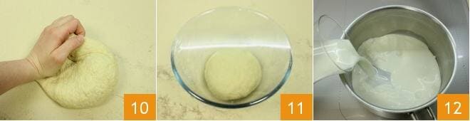 Transferidla entonces a una superficie de trabajo ligeramente engrasada, trabajadla un poco y formad una bola 10; ponedla en un bol y cubrid con film transparente 11; dejad levar durante 2 horas en el horno apagado con la luz encendida. Mientras tanto, dedicaos a la crema pastelera: en un cazo verted la leche y la nata y calentad a fuego lento 12