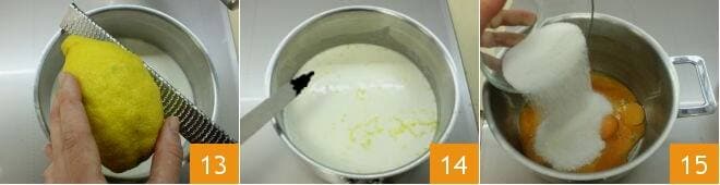 junto con la cáscara rallada de 1 limón no tratado 13 y las semillas de 1 vaina de vainilla 14 (para un aroma de vainilla más intenso podéis poner en infusión también la vaina de vainilla cortada y retirarla posteriormente). En otro cazo verted las yemas (con las claras podéis hacer merengues o galletas de gato) y el azúcar 15.