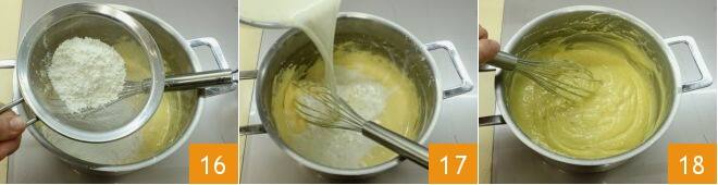 Trabajad las yemas con el azúcar con un batidor, luego tamizad la maicena 16. Mezclad de nuevo y luego verted en un hilo la leche calentada previamente y aromatizada (tened cuidado de retirar la vaina de vainilla antes de verter la leche si la habéis utilizado) 17. Mezclad hasta que la crema haya alcanzado la consistencia ideal espesándose 18.