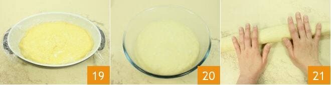 En ese momento apagad el fuego y transferid la crema a una fuente baja y amplia: cubrid con film transparente en contacto 19, para que al enfriarse no se forme una molesta película en la superficie. Luego dejad que se enfríe a temperatura ambiente y luego en el frigorífico. Cuando la masa haya duplicado su tamaño 20, tomadla y estiradla formando un cilindro en una superficie de trabajo ligeramente enharinada (o engrasada) 21.