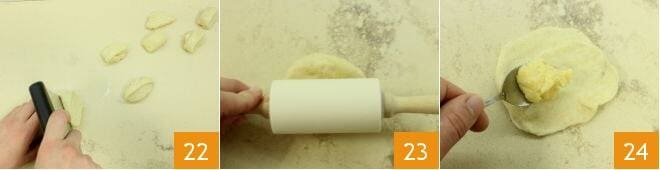 Obtened con una espátula (o un cuchillo de hoja bien afilada) 30 piezas de 30 g cada una 22; extended cada pieza con las manos, o estiradla con un rodillo 23, luego rellenadla con una cucharada de crema pastelera ya fría y cuajada 24.