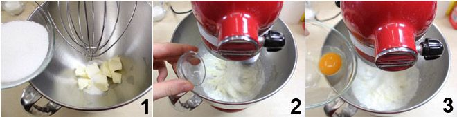 Para preparar las dentaduras, bate la mantequilla a temperatura ambiente cortada en trozos en una batidora junto con el azúcar 1 hasta obtener una mezcla clara y espumosa. Añade la pizca de sal 2 y el huevo 3. Sigue batiendo hasta que todos los ingredientes estén bien combinados.