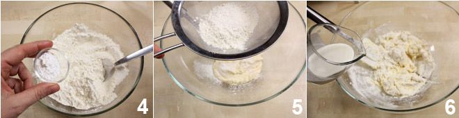 Aparte, en un bol mezcla la harina con la levadura 4 y la fécula de patata. Transfiere la mezcla de mantequilla, azúcar y huevo a otro bol y tamiza las harinas sobre ella 5 luego incorpóralas con una espátula de abajo hacia arriba y mezcla añadiendo en hilo la nata y por último las semillas de la vaina de vainilla 6.
