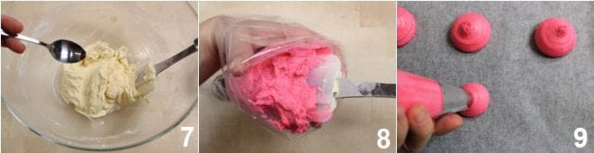 Por último, añade el colorante alimentario, suficiente para obtener un rosa intenso 7. Transfiere la masa obtenida en una manga pastelera 8 con boquilla lisa de un diámetro de 1,5-2 cm y presiona montoncitos de masa con un diámetro de 4 cm al menos 2 cm de altura sobre una bandeja forrada con papel de horno 9. Hornea en horno estático precalentado a 180º durante unos 13-14 minutos, luego retira y deja enfriar los whoopie de colores.
