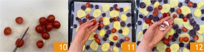 Partid por la mitad los tomates cherry 10 y distribuidlos en la bandeja junto con las patatas 11. Añadid 2 dientes de ajo 12.