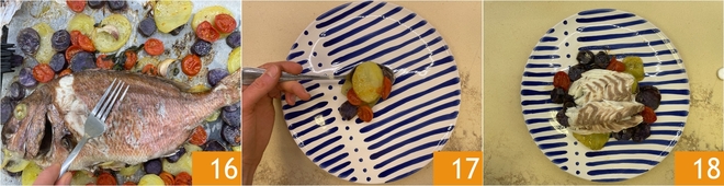 Transcurrido el tiempo de cocción, sacadlo del horno y retirad la piel del dentón con la ayuda de un tenedor 16. Emplatad las verduras 17 y colocad encima los filetes de pescado. ¡Vuestro dentón al horno con patatas está listo para servirse 18!