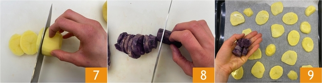 Ahora ocupaos de las patatas amarillas y moradas: peladlas y cortad las patatas amarillas en rodajas de unos 4 mm 7, mientras que las patatas moradas en trozos de 1 cm 8. Colocadlas en la bandeja separadas entre sí 9.