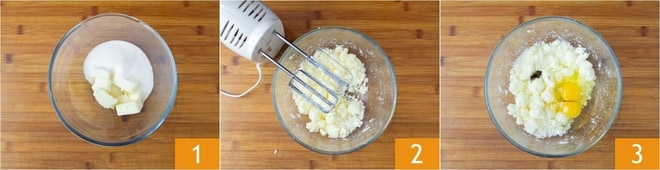 Para preparar la desmenuzada de ricotta y mermelada lo primero que debes hacer es dejar escurrir la ricotta en un colador de malla fina durante 30 minutos. Mientras tanto, dedícate a la preparación de la base. En un bol, vierte el azúcar, añade la mantequilla 1 y trabaja con una batidora durante unos minutos hasta obtener una mezcla arenosa 2. Luego, añade los huevos y el extracto de vainilla 3.