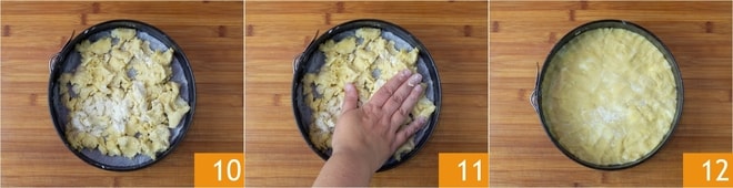 Forra con papel de horno un molde desmontable de 22 cm de diámetro, distribuye dentro la mitad de la masa 10 y compacta con las manos 11 hasta cubrir completamente la base del molde 12.