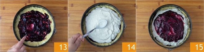 Cubre la base con la mitad de la confitura dejando libre un borde de aproximadamente 1 cm 13, luego vierte también la crema de ricotta 14. Finalmente, añade delicadamente el resto de la confitura sobre la crema 15.