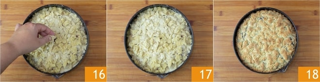 Cubre todo con el resto de la masa 16 llegando hasta el borde exterior 17. Cocina en horno estático a 180° durante 45 minutos, hasta que la desmenuzada esté bien dorada 18. Déjala enfriar completamente y extráela del molde. ¡La desmenuzada de ricotta y mermelada está lista para ser disfrutada!