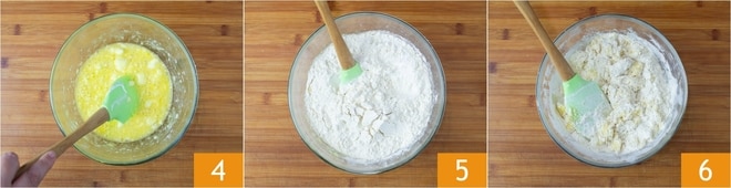 Trabaja la mezcla con la espátula 4, luego añade la harina 00 y la levadura, previamente tamizadas 5. Mezcla primero con una espátula 6.