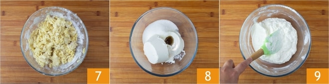 Continúa luego con las manos hasta obtener unas migas grandes y reserva 7. Pasa al relleno: en un bol, pon el azúcar, la ricotta y el extracto de vainilla 8, luego trabaja con la espátula, el resultado deberá ser una crema homogénea 9.
