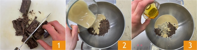 Para preparar los dulces de chocolate y tahina, lo primero que hay que hacer es picar el chocolate negro 1 y derretirlo al baño maría junto con la tahina 2 y la miel 3. Remueve hasta que todo el chocolate se haya derretido y obtengas una mezcla homogénea.