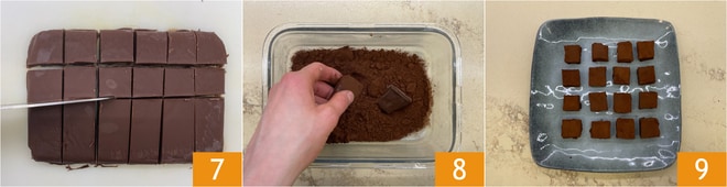 Transcurrido el tiempo de solidificación, corta la placa en cubitos regulares 7, luego pásalos por el cacao amargo 8. ¡Tus dulces de chocolate y tahina están listos para ser servidos 9!