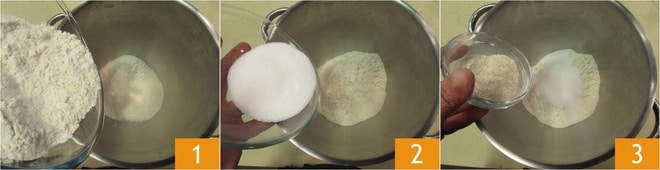 Para realizar los donuts, primero calienta ligeramente la leche que necesitarás para preparar la masa. Mientras tanto, vierte en el bol de una batidora equipada con gancho la harina 00 y la harina manitoba 1. Añade el azúcar 2 a la levadura de cerveza con masa madre deshidratada 3.