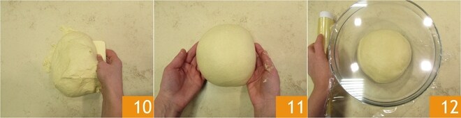 Separa la masa del gancho con las manos ligeramente humedecidas, luego ayúdate con una espátula para volcarla sobre la superficie de trabajo 10. Espolvorea con un poco de harina y da a la masa una forma esférica, siempre ayudándote con una espátula para manejarla más fácilmente 11. Transfiérela a un bol grande, previamente engrasado, cubre con film plástico y deja reposar durante 2 horas en el horno apagado con la luz encendida 12.