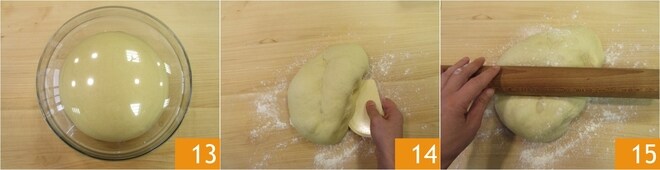 Pasado el tiempo de leudado, la masa habrá duplicado su tamaño. Transfiérela nuevamente a la superficie de trabajo ligeramente enharinada 14 y extiéndela con el rodillo 15.