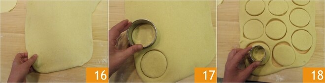 Debes obtener un grosor de 1 cm 16. Utilizando un cortador de pasta de 8 cm de diámetro, corta círculos de la masa 17, colocándolos bien juntos. En este punto, usando un cortador de pasta más pequeño, de 4,5 cm, haz los agujeros de las rosquillas 18.