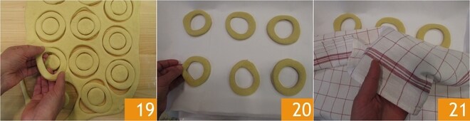 Levanta delicadamente las rosquillas 19 y colócalas sobre cuadrados de papel de horno de aproximadamente 10 cm de lado colocados en una bandeja 20; transfiere también los recortes de masa a una bandeja forrada con papel de horno. Cubre las bandejas con un paño de cocina 21 y deja leudar durante 40 minutos alejadas de corrientes de aire.