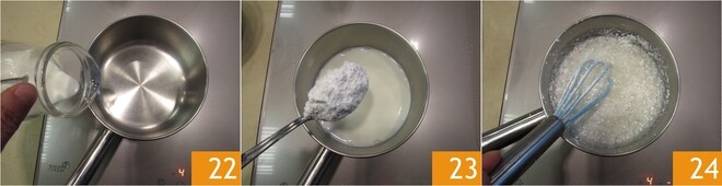 Cuando las rosquillas estén casi leudadas, puedes dedicarte a la glasa. Transfiere la leche a un cazo 22, caliéntala y añade el azúcar glas 23. Remueve con unas varillas mientras tanto 24.