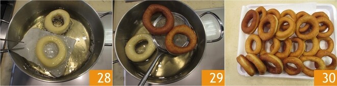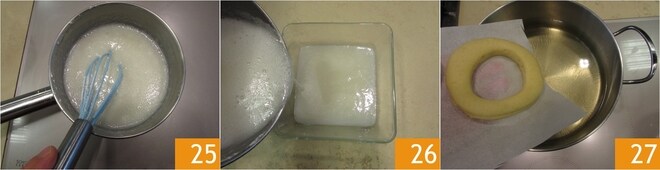 Cocina hasta que la mezcla se haya espesado 25, transfiérela a un bol pequeño 26 y deja enfriar. Pasa a la fritura. Calienta el aceite de semillas en una olla grande hasta que alcance la temperatura de 175 °C. Cuando el aceite esté caliente, levanta la primera rosquilla usando el papel de horno y sumérgela en el aceite 27. Usando el papel de horno, la forma no se modificará.