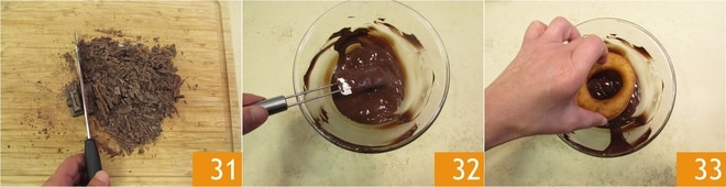 Mientras las rosquillas se enfrían un poco, puedes dedicarte a derretir el chocolate. Tritúralo 31 y pásalo al microondas, accionándolo unos segundos a la vez, hasta que esté derretido 32. Alternativamente, puedes derretir el chocolate al baño maría. Pasa ahora a la decoración. Sumerge el primer donut en el chocolate solo hasta la mitad 23.