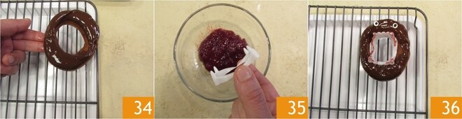 Levántalo y colócalo boca abajo sobre una rejilla 34. Mancha unos dientes de plástico con mermelada 35 y colócalos dentro del agujero de la rosquilla. Decora también con los ojitos 36.