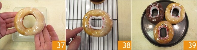 Haz ahora lo mismo para decorar los donuts con la glasa de leche. Sumérgelos en la glasa, colócalos boca abajo 37, transfiérelos a una rejilla y decora como acabas de hacer 38. Sigue hasta terminar los ingredientes, deja que se solidifiquen y sirve tus donuts vampiro 39!