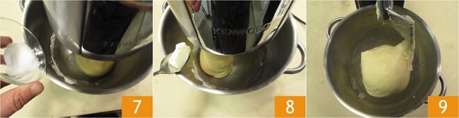 Finalmente, añade también la sal 7 y continúa trabajando hasta que la masa se haya despegado de las paredes del bol y esté bien integrada. En este punto, puedes añadir la mantequilla ablandada, un trozo a la vez 8, asegurándote de que la anterior haya sido bien absorbida antes de añadir más; tomará aproximadamente 15-20 minutos. Debes obtener una masa lisa y homogénea 9.