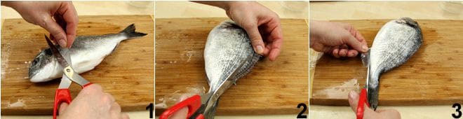 Para empezar a preparar la dorada a la agua loca, comenzad con la limpieza de la dorada. Escamad y eliminad las aletas laterales de la dorada 1, las dorsales 2 y las ventrales 3 (podéis dejar la caudal para verificar posteriormente la cocción del pescado).