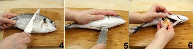 Escamad la dorada 4, realizad un corte en la barriga 5 y eviscerad la dorada 6.