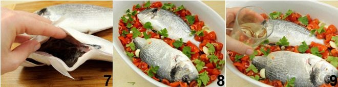 Luego enjuagad la dorada bajo agua fresca corriente asegurándoos de haberla limpiado bien también por dentro 7. Colocad dentro de la barriga una pizca de sal, un diente de ajo y un par de hojitas de perejil. Coged una fuente para horno (o una bandeja), untad el fondo con aceite de oliva virgen extra, luego colocad las doradas (o la dorada si habéis elegido la de 800 gr). Cortad los tomatitos en gajos o cubos y agregadlos en la fuente junto con los dos dientes de ajo restantes cortados en rodajas, el perejil en hojas 8, la sal y la pimienta (o guindilla fresca si os gusta), el agua y el vino blanco 9; los líquidos no deben cubrir completamente las doradas sino quedar a menos de la mitad de la altura del pescado. Hornead en horno ya caliente a 220° durante unos 20-25 minutos: para asegurarse de que el pescado esté cocido deberíais intentar arrancar la aleta caudal: si se desprende fácilmente, la dorada estará cocida, de lo contrario, si ofrece resistencia, cocinad el pescado durante unos minutos más.