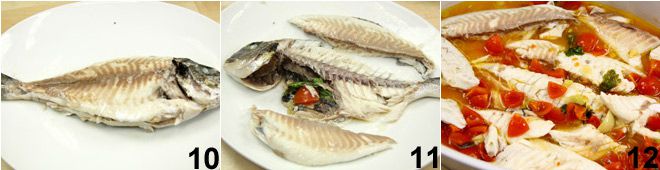 Cuando la dorada a la agua loca esté cocida, sacad la fuente del horno, colocad la dorada en un plato, eliminad la piel 10 y dividid la dorada en filetes 11 eliminando todas las espinas (la grande central y las laterales) y la cabeza. Una vez obtenidos los 4 filetes, colocadlos en un plato de servir, rociándolos con el fondo de cocción 12 y servid inmediatamente. Si preferís la cocción en sartén, proceded de la misma manera, cocinando sobre fuego con una tapa en el recipiente utilizado.