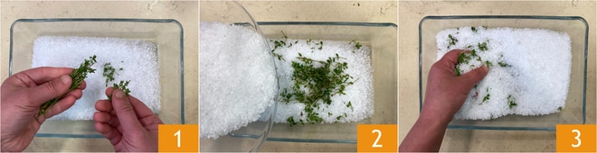 Para preparar la dorada a la sal, lo primero que hay que hacer es verter el primer kilo de sal en una fuente para horno, añadir el tomillo limón 1, luego agregar el resto de la sal 2 y mezclar 3.