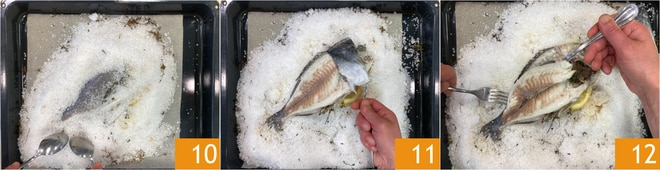 Una vez cocida, romper la costra de sal con 2 cucharas 10, quitar la piel con cuidado 11 y extraer los filetes 12. Usando dos tenedores será fácil levantar los filetes por encima de la espina; luego levantando la cabeza, quitar la espina y extraer también los filetes inferiores.
