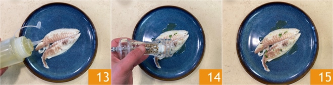 Emplate, sazone con aceite 13, tomillo y pimienta 14. La dorada a la sal está lista para ser disfrutada 15.