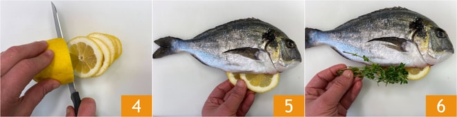 Mientras tanto, cortar el limón en rodajas 4 y llenar el vientre de la dorada, previamente limpiada y eviscerada, con las rodajas de limón 5 y el tomillo limón 6.