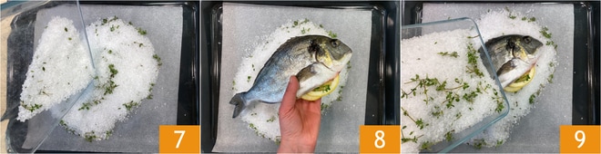 Verter sobre la bandeja, forrada con papel de horno, menos de la mitad de la sal aromatizada 7, colocar encima la dorada 8 y cubrir con el resto de la sal, presionando bien para que se adhiera al pescado 9. Cocer en horno estático, precalentado, a 200°C durante 25-30 minutos.